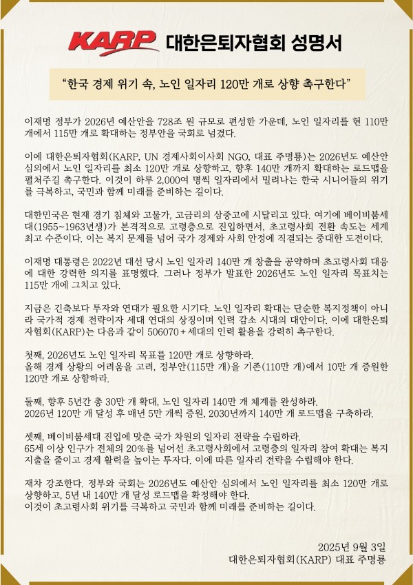 | 제목 | 대한은퇴자협회,노인 일자리 120만개 상향 촉구 | |||||