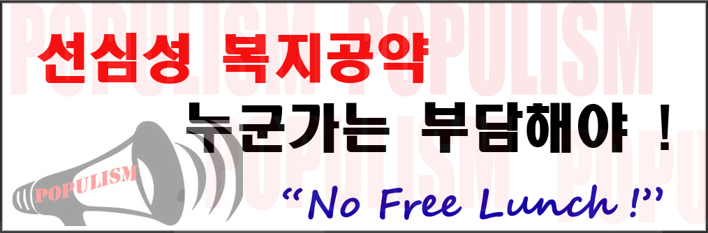 선거때면 늘 나타나는 화두인 무상교육,무상급식,무상의료,무상주거로 대표되는 무상복지 포퓰리즘을 이제 정치하는 사람 모두 다시한번 심각하게 생각해 볼 때이다. 우리 후세대에 엄청난 부담이 되는 무상복지를 그냥 방치하면 대한민국의 미래를 누구든 낙관할 수 없을 것이다.